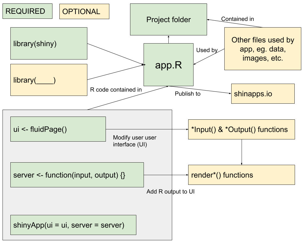 The concept map below illustrates the key components of a Shiny app and how they relate to one another.