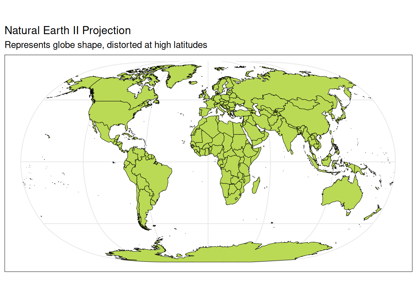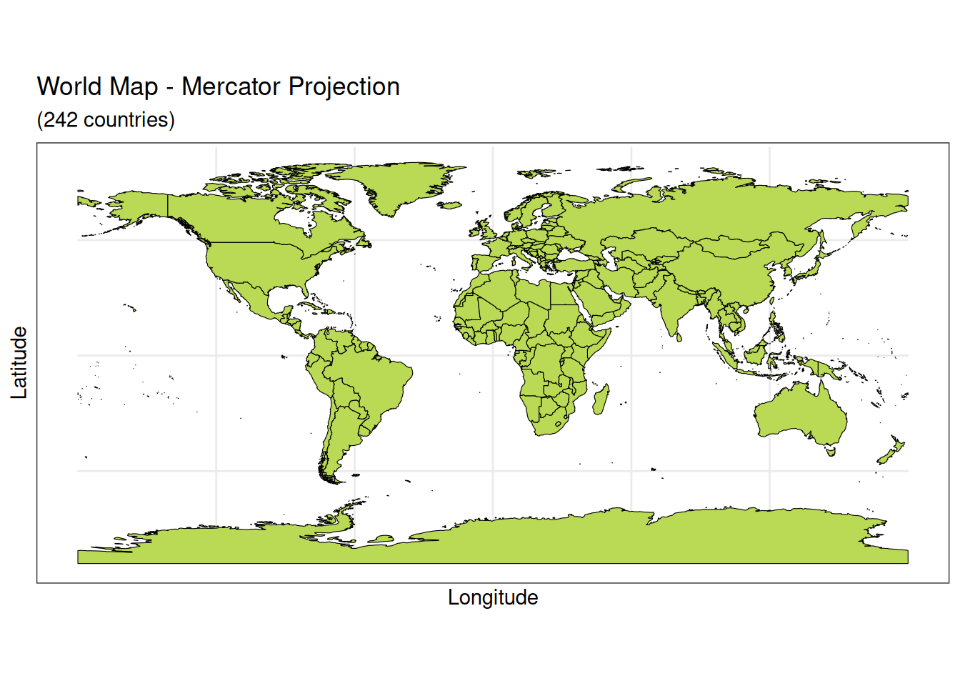 labs(x = "Longitude", y = "Latitude", title = "World Map - Mercator Projection", subtitle = paste0("(", length(unique(world$name)), " countries)")) +