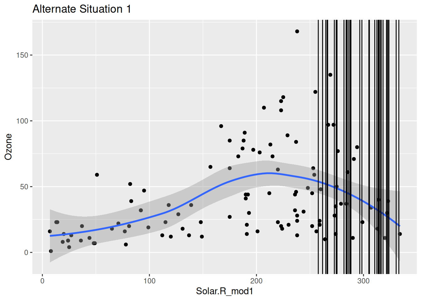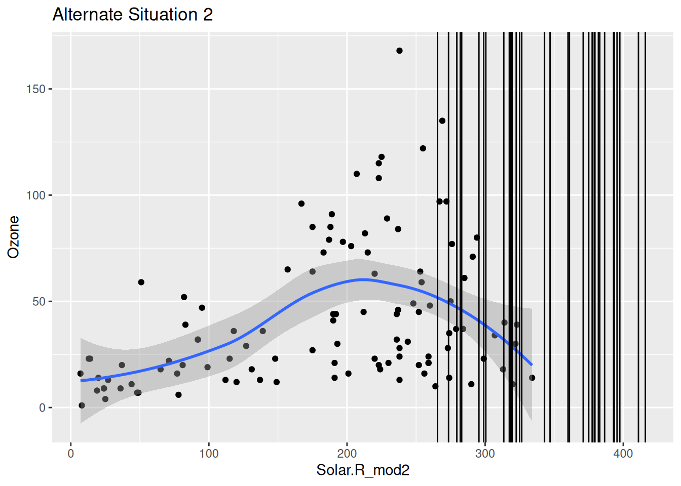 In Alt 2 version, Ozone is missing when Solar is beyond the values of our observed data so we don’t have good sense of what the relationship would be between Solar and Ozone.