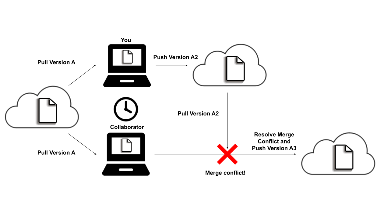 When two collaborators are working on the same committed version of the files and change the same line in a file, there will be a merge conflict. In order to proceed, the 2nd individual attempting to push a new commit will need to resolve the conflict first.